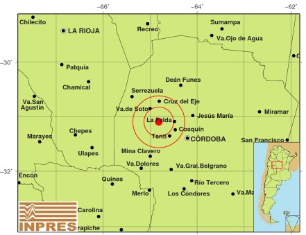Epicentro: 32 km al O de La Falda, -31.098 (lat) -64.817 (long)